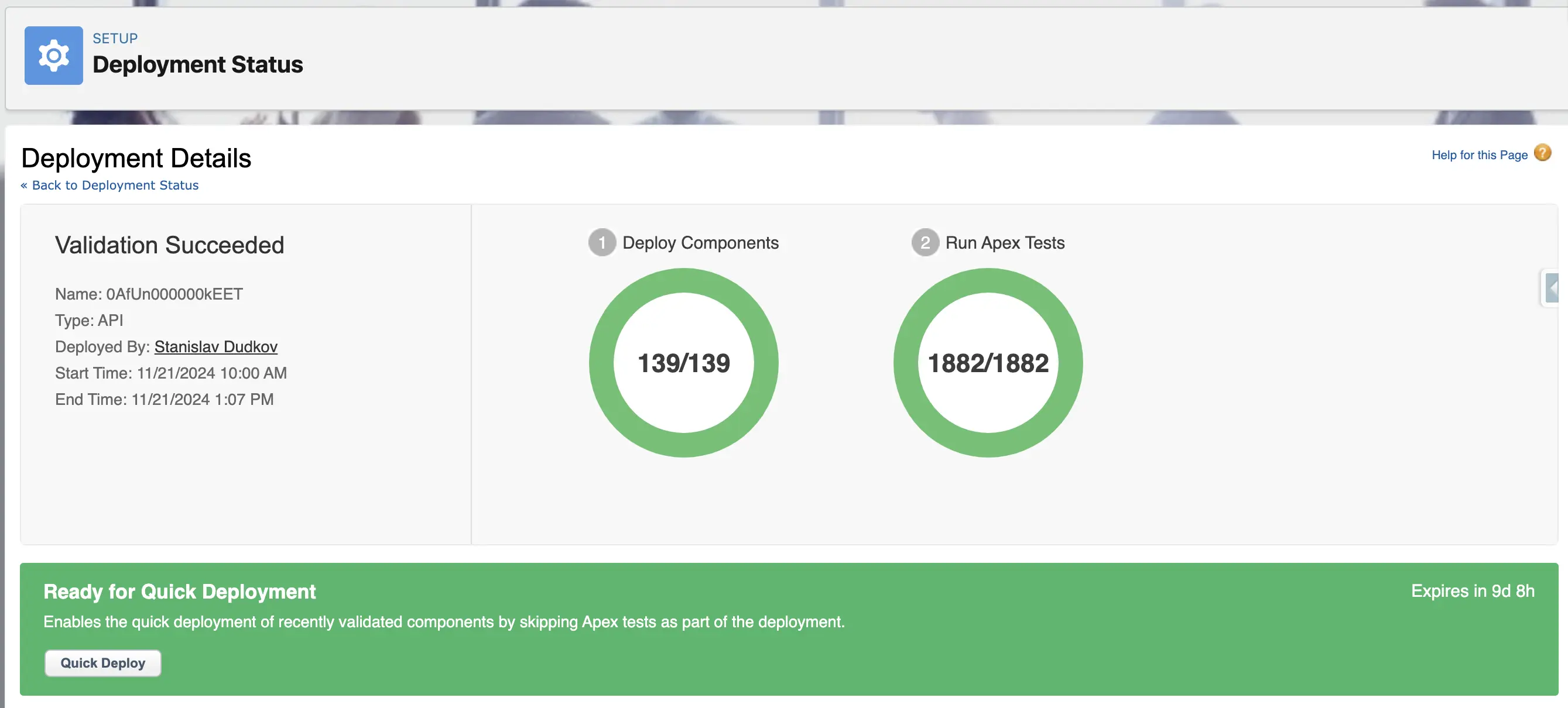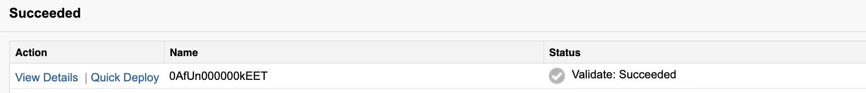 You will receive a Deployment ID, and if validation is successful, you can use this ID to initiate a Quick Deploy.
